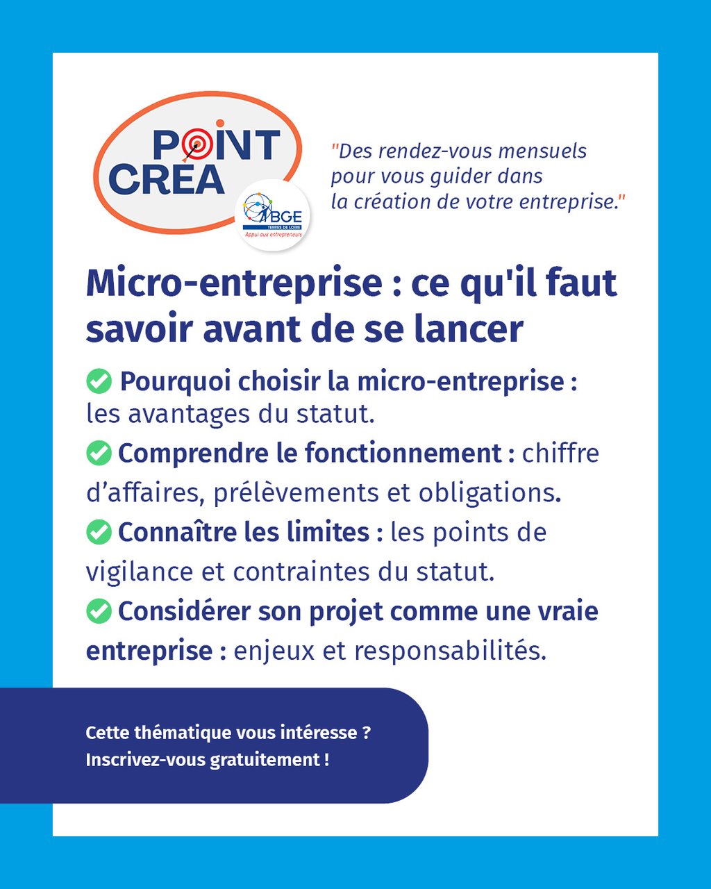 Le thème traité au cours du premier « Point créa » sera : « Micro-entreprise : ce qu’il faut savoir avant de se lancer ». Rendez-vous le mardi 03 février 2026 de 09h à 10h dans les locaux de la Mairie de Mondoubleau. (inscription obligatoire : flashez le Qrcode de l’affiche ou contactez L'Egrenne au 06 21 37 87 40 )