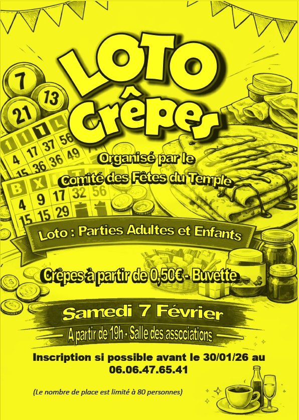 La soirée crêpes puis loto aura lieu le samedi 7 février 2026 dans la salle des fêtes du Temple, à partir de 19h00.